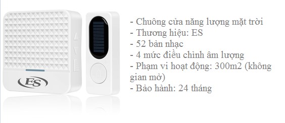 Chuông báo khách năng lượng mặt trời của hãng ES luôn là một trong những mẫu chuông cửa được khách hàng ưa thích lựa chọn bởi tính năng tiết kiệm năng lượng, thân thiện với môi trường. Sản phẩm rất phù hợp với nhà biệt thự, nhà phố,... Khi có khách đến thăm, sau khi nhấn chuông thì các bản nhạc, lời chào sẽ phát ra để gia chủ được biết.