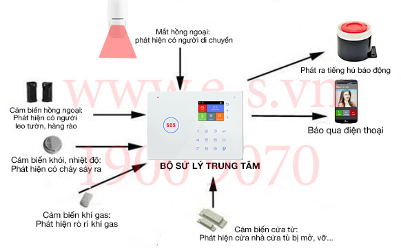 Nguyên lý hoạt động : Khi các thiết bị phát hiện trộm phát hiện có trộm đột nhập ngay lập tức sẽ truyền tín hiệu cho bộ trung tâm, bộ trung tâm sẽ gọi điện và nhắn tin đến điện thoại của chủ nhà đã được cài đặt sẵn trước đó