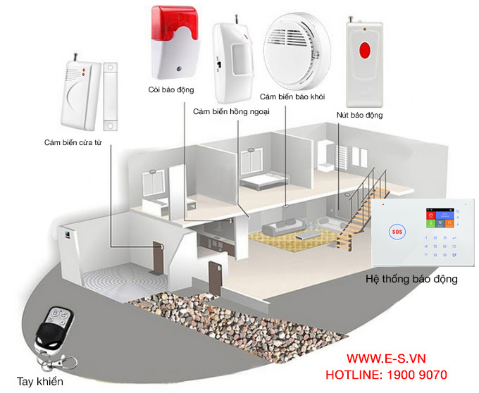 >> Báo động cháy, khí ga, cửa, sảnh, cửa sổ, ban công, và báo động nơi ranh giới.