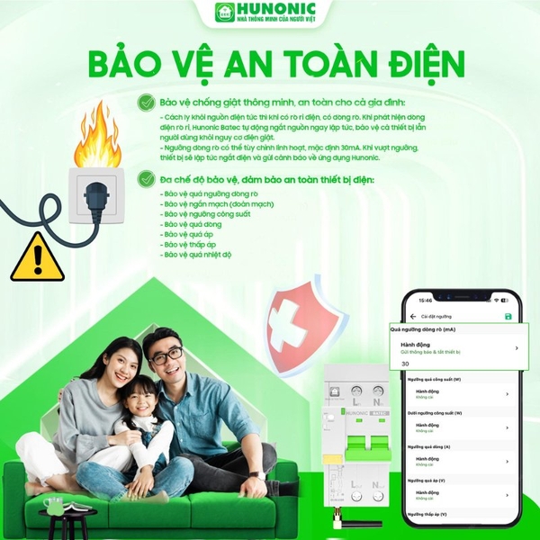 Nhờ đó, Hunonic Batec giúp ngăn ngừa nguy cơ điện giật, cháy nổ và hư hỏng thiết bị điện trong gia đình.