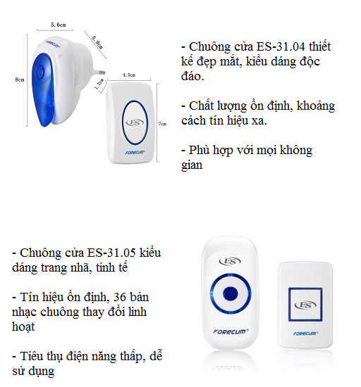 Các mã chuông cửa báo khách ES này lắp đặt đơn giản, trong đó nút nhấn dùng pin, chuông cửa cắm điện với nguyên lý tiêu hao năng lượng thấp. Chất liệu nhựa cao cấp chống cháy nổ, thân thiện với sức khỏe người dùng.